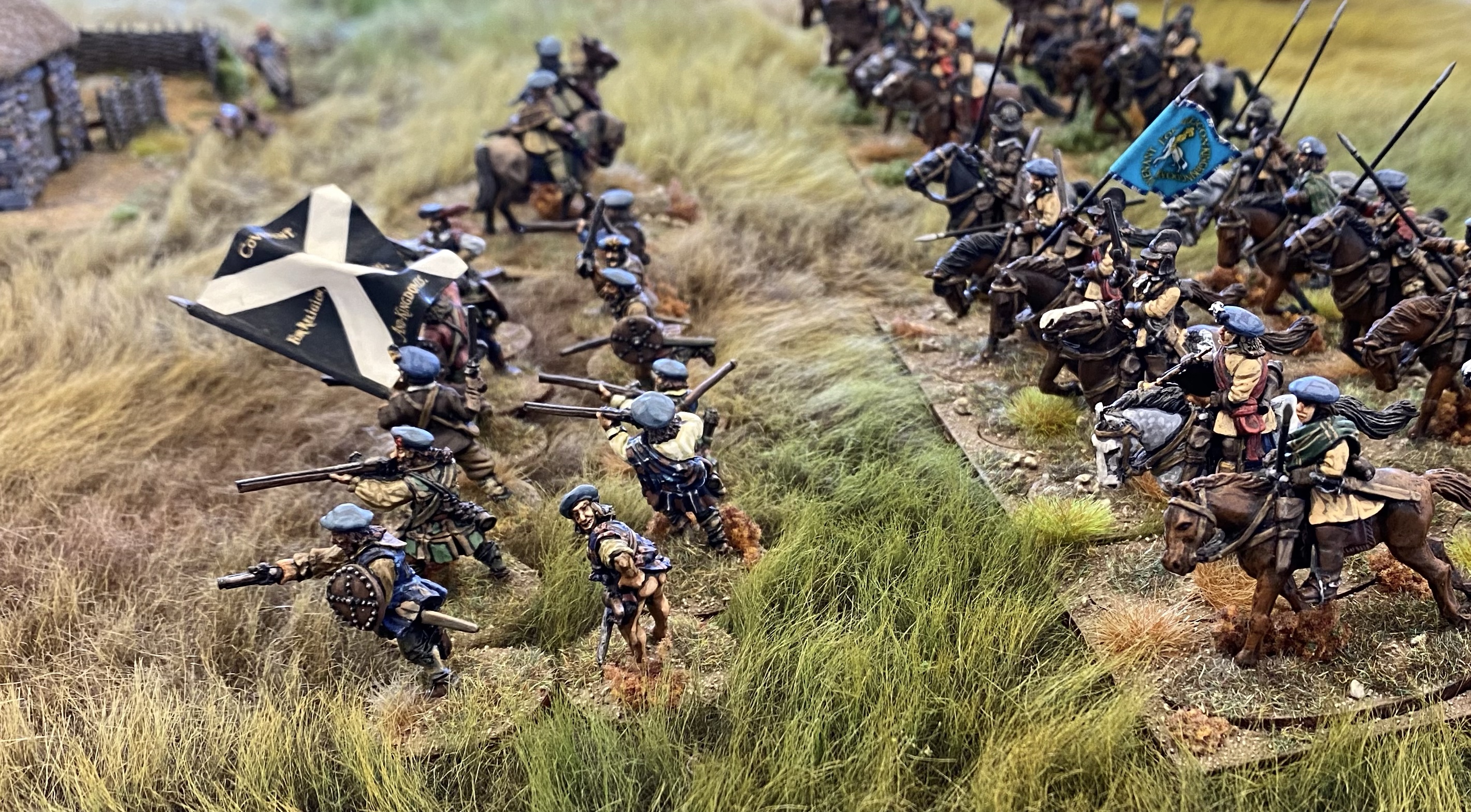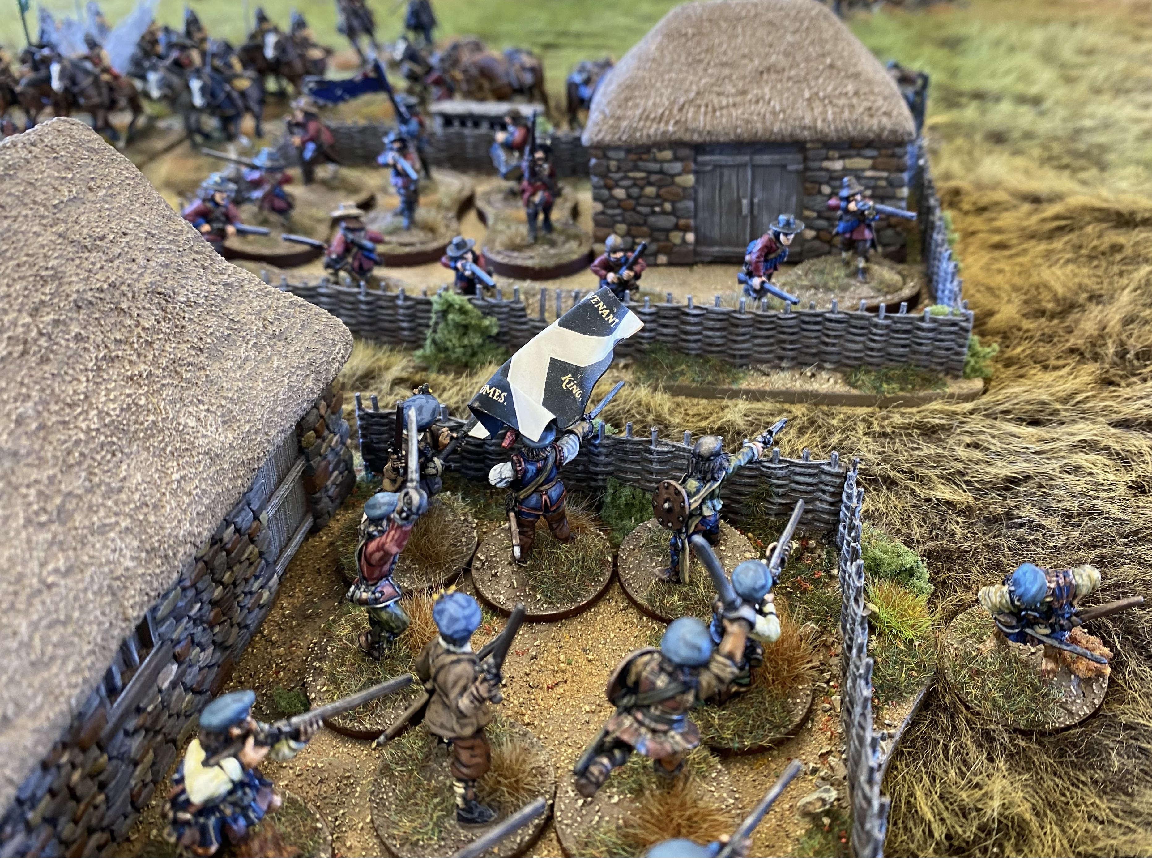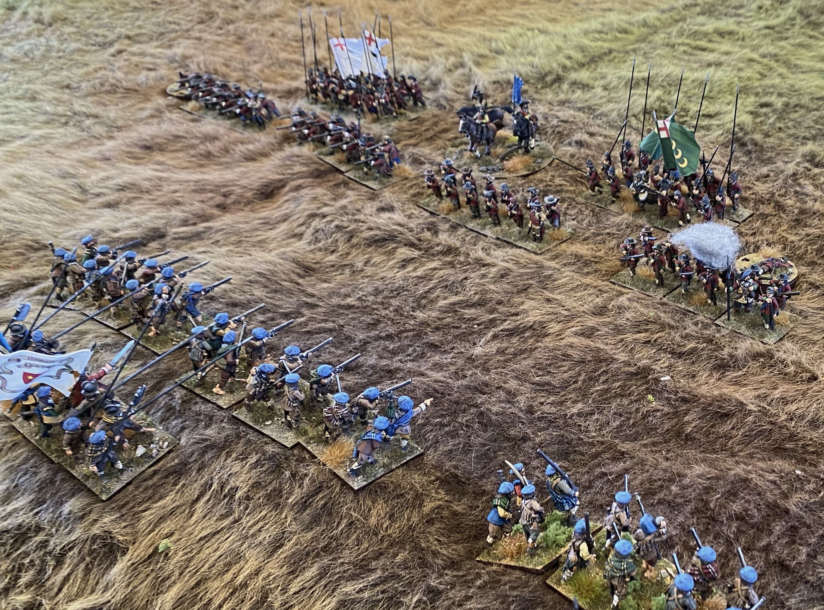 28mm figures using Warlord Games’ Pike & Shotte rules. Loosely based on the Battle of Inverkeithing, with Lambert breaking out from the English bridgehead over the Forth, and Holbourne’s Scots trying to stop them. A close fought game that ended in an English victory.