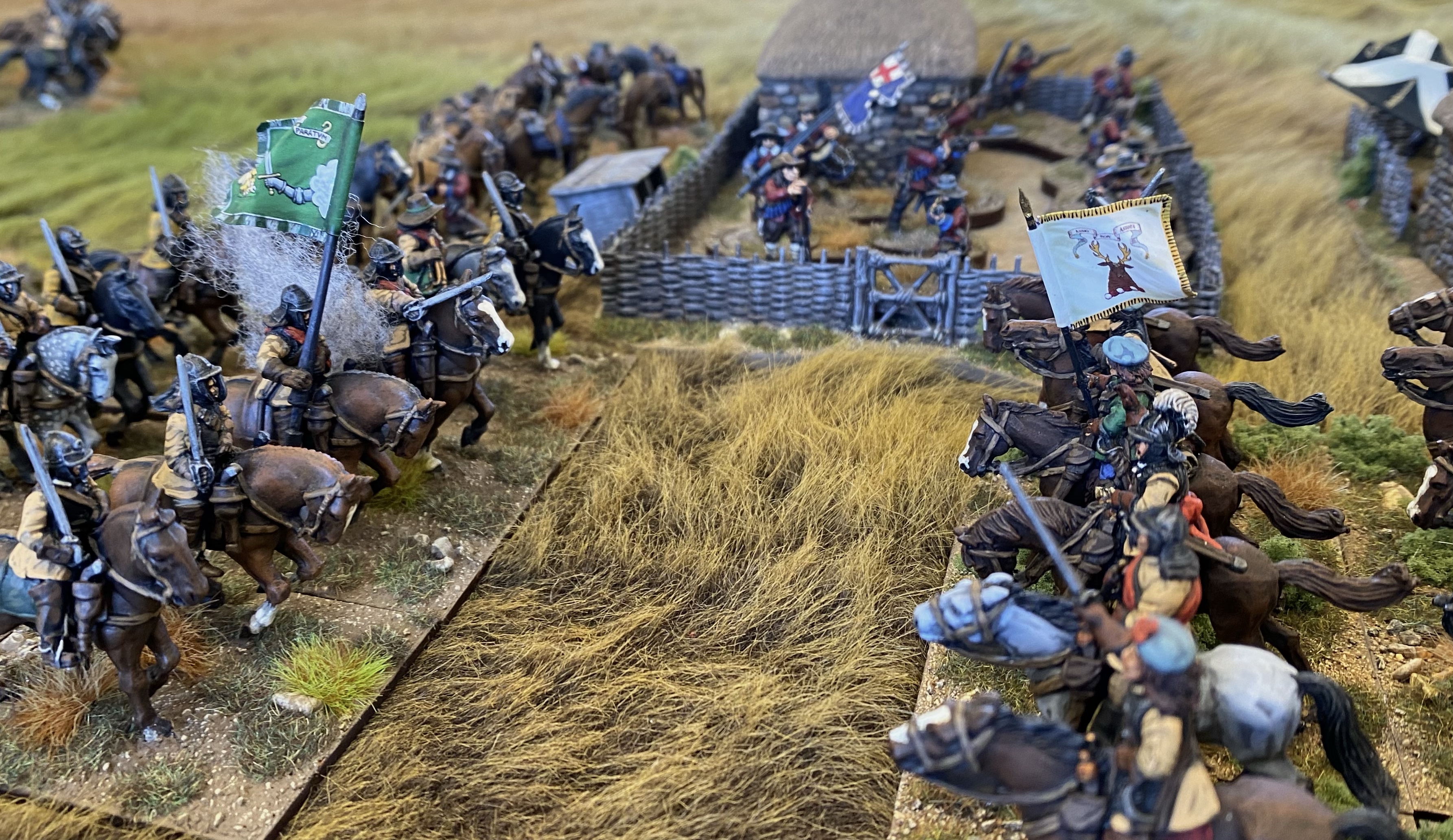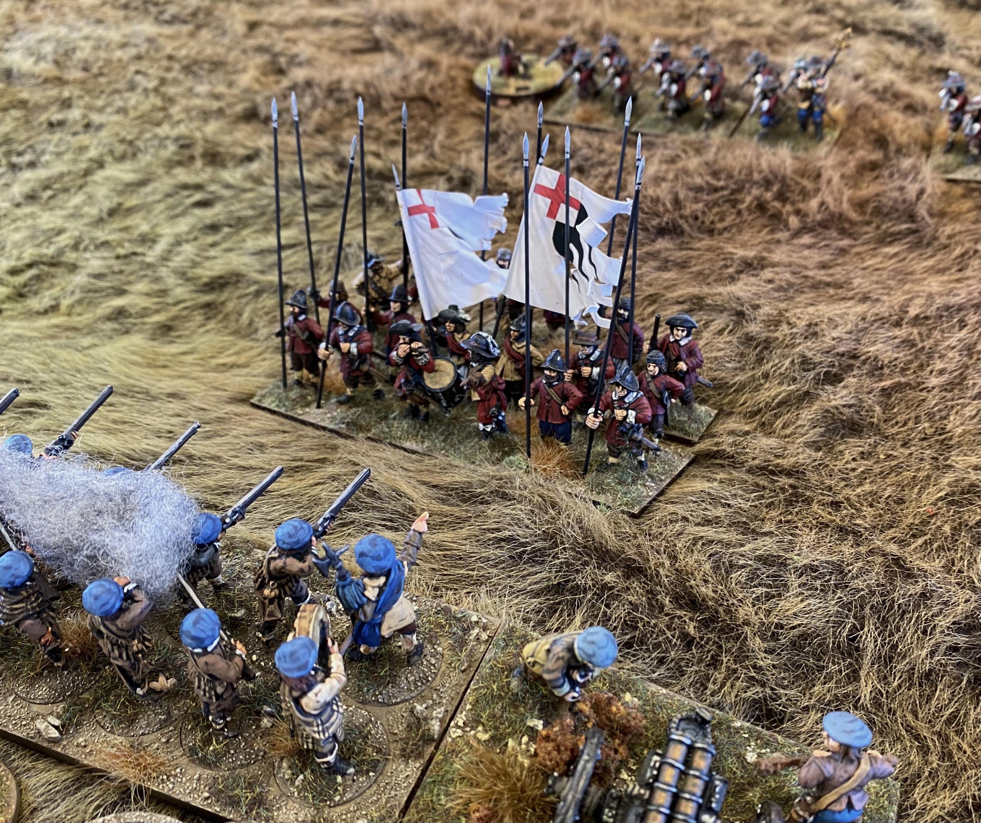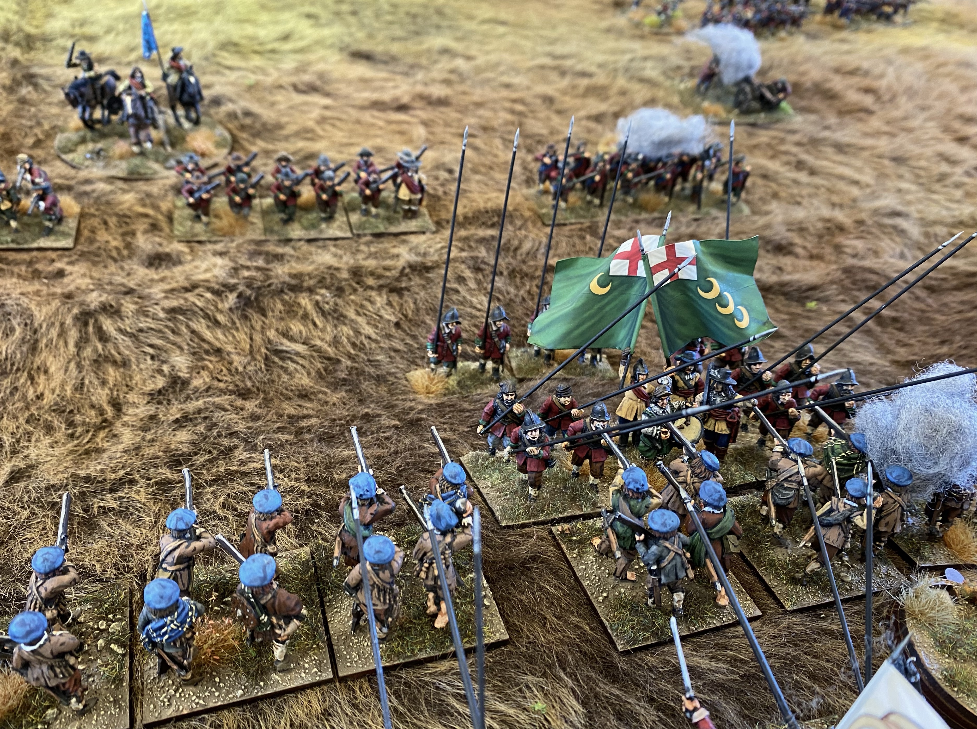 28mm figures using Warlord Games’ Pike & Shotte rules. Loosely based on the Battle of Inverkeithing, with Lambert breaking out from the English bridgehead over the Forth, and Holbourne’s Scots trying to stop them. A close fought game that ended in an English victory.
