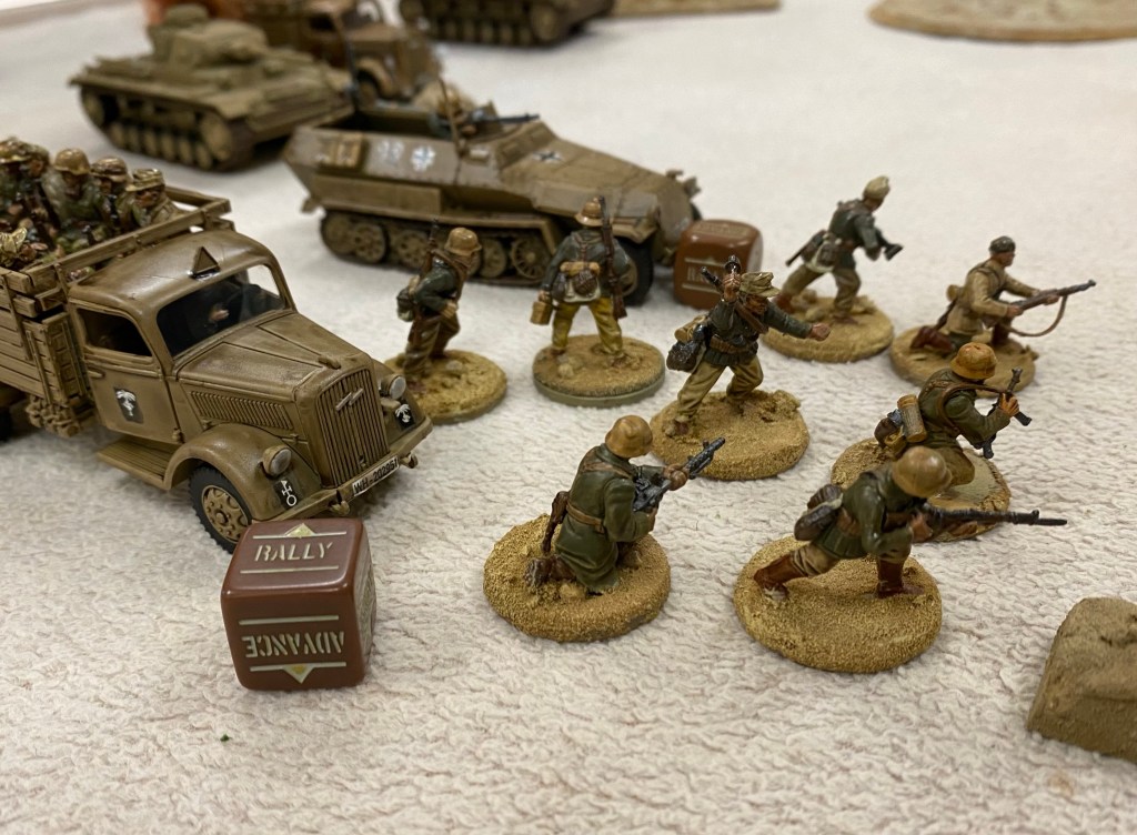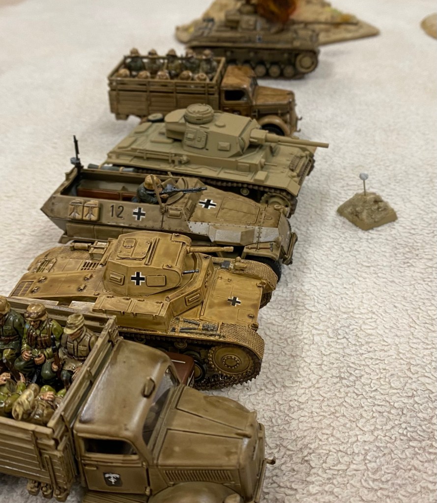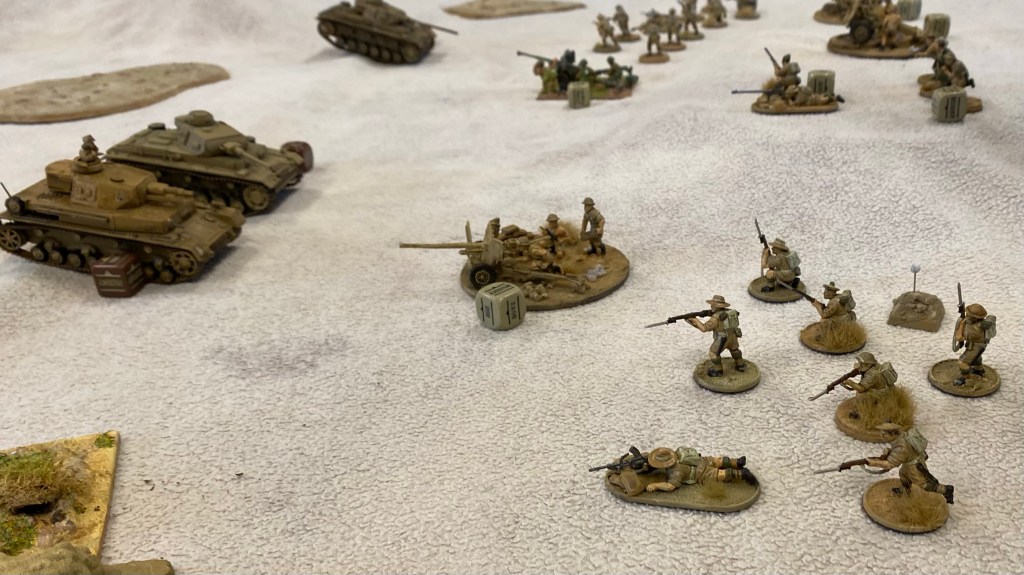 A classic pair of WWII enemies in a game of Bolt Action that saw DAK armour and motorised Infantry assaulting 8th army artillery, AT guns and infantry.