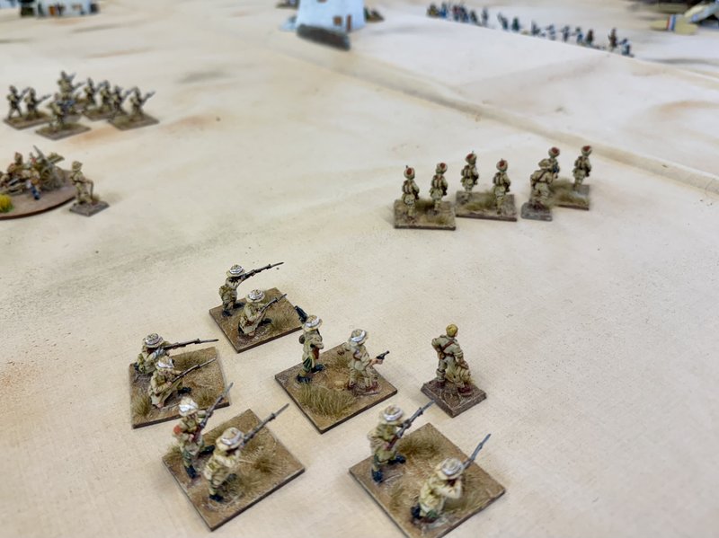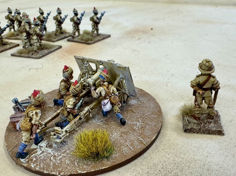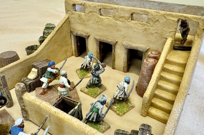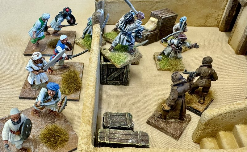 A vert tense game ensued as the Empire troops attempted to rush to the rescue of the downed biplane’s crew, avoiding the angry and well armed tribesmen on the way. Bertie and Jeeves managed to make it from the wreck (along with the biplane’s Lewis gun) to a nearby compound. Unfortunately a unit of the tribesmen gave chase and stormed the compound. After holding back the Afghan swordsmen with the Lewis Gun for a while, Jeeves was put out of action when the Afghans got in to melee. Bertie bravely fought on and his imposing figure at the top of the compound’s stairway (some may say, almost Gordon like) held off the Afghans with sheer pluck, and a very stiff upper lip, for a few turns. It was not enough though, and the rescue force just couldn’t make it through to him in time. Bertie went down in a flurry of blades. With the agents both “back in the pavilion before tea”, this innings was given to the Khasi.
