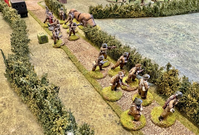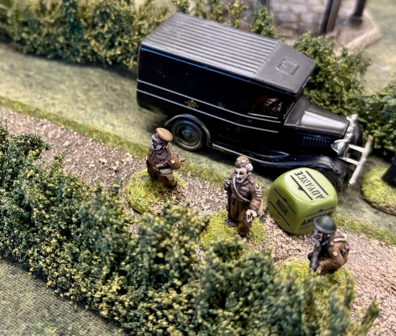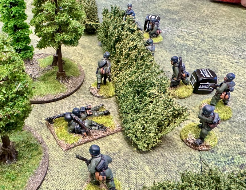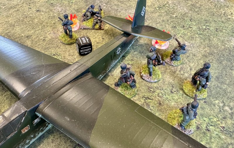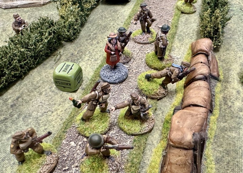 However the high point of the game was when the Germans went into hand to hand combat with Pike and Jones. The brave duo (“Don’t Panic, Pike!”) were both given near fatal wounds, but recovered when administered to by Godfrey, and then went on to capture the whole German squad! Sadly Captain Square was not so lucky; he took a direct hit from the Fallschirmjäger flame thrower. Even Godfrey’s lavender water couldn’t save him.