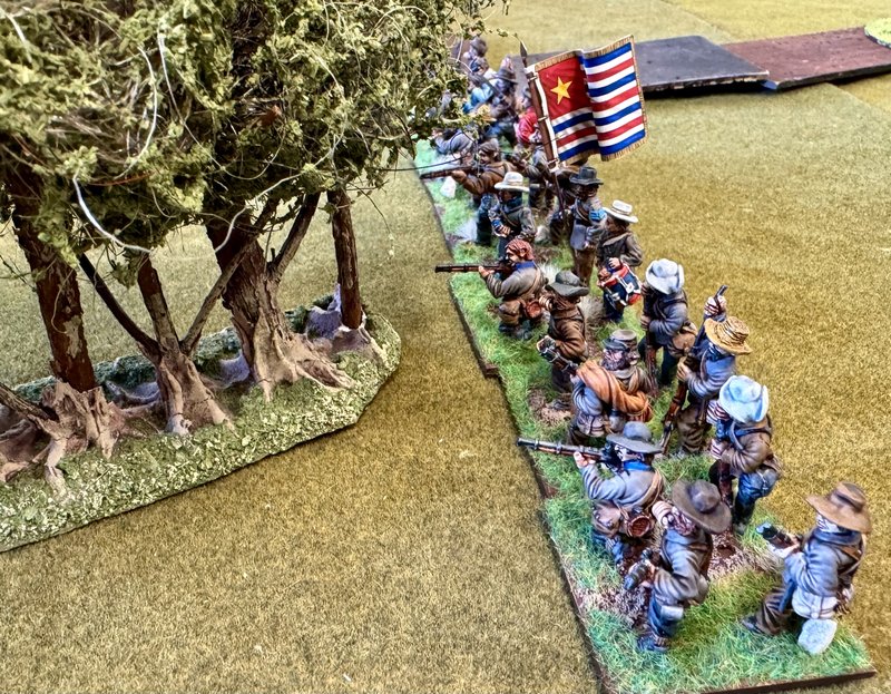 The boys from Louisiana came forward to catch the federals on the hop. Hoping to catch the Federals by advancing through the cover of the woods, their position was given away when their artillery, rather then moved forward and unlimber, instead lost control after a blunder and rushed forward finishing just in front the hastily formed Federal defensive line. On the other flank the boys from Texas took up a defensive position at the edge of the woods.