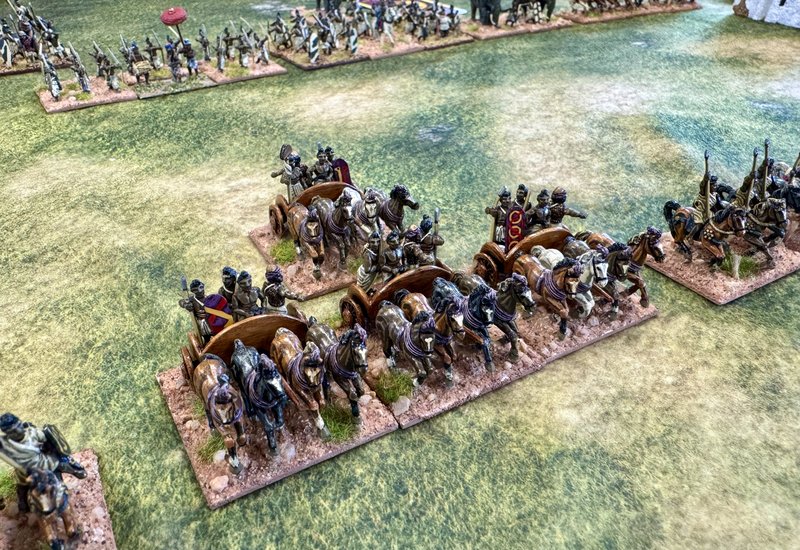The game followed the actual battle’s deployment with Porus’ son leading a command of chariots and cavalry ahead of the main Indian battle line. Things went badly for the Indians from the start when the Macedonian phalanx quickly pinned the Indian cavalry command which then masked the massed pikes from the Indian infantry’s bow-fire. It all ended messily for the Indians but at least gave a historical results for the battle.