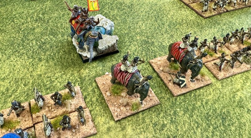 A newly completed Alexandrian Macedonian army was the impetus for this classic ancient refight, phalanx v. elephants, chariots and bow-fire. The Hail Caesar rules were heavily modified, as an experiment, by grafting on the movement system from Mortem et Gloriam.