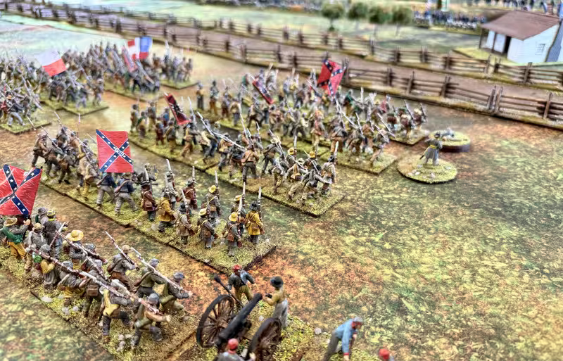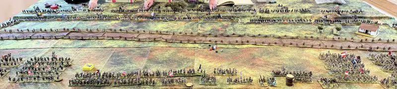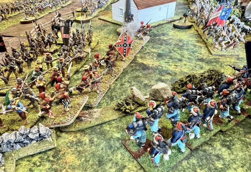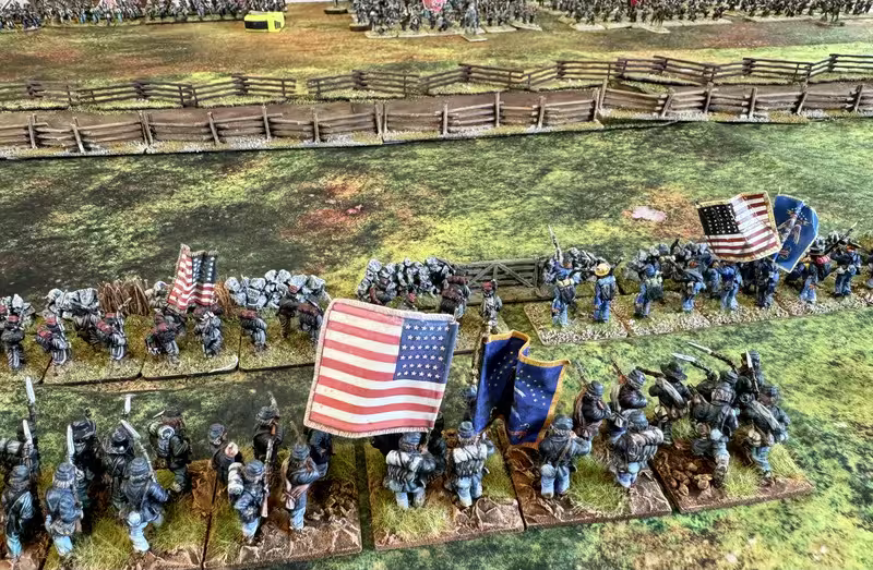 The game represented the titanic struggle on the third day of Gettysburg with the Confederates last major attack on the Union main line. Several Friends had their collections on the XL table for this game. It was an exciting contest with the Confederates pushing hard all day, and managing a breakthrough the Union frontline in at least one place. However their casualties meant that, when time was called, the game was a Union win. Better luck next time, Johnny Reb!