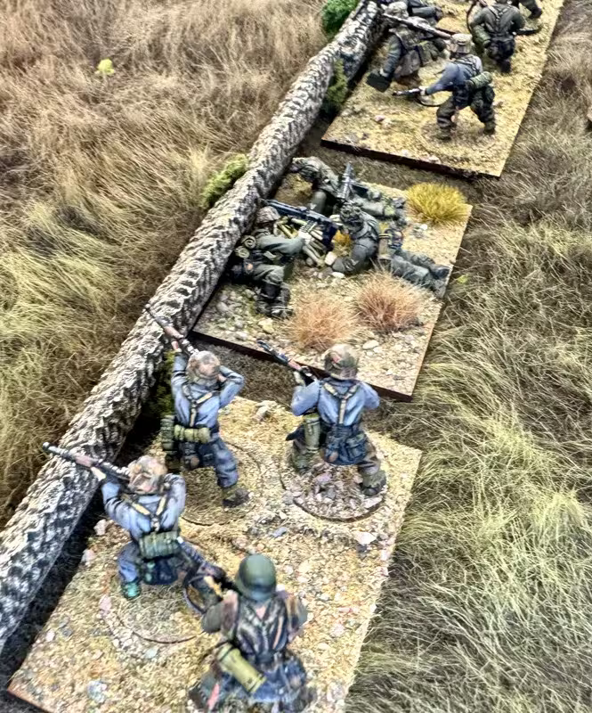 First time on the table for this lovely collection of 28mm figures. The game was set in early 1945, somewhere near the Rhine. A platoon of British infantry (from the Worcestershire Regiment, of course!) encountered a platoon of Wehrmacht infantry with both sides seeking to scout out the enemy lines and capture strong points. The British spotted the Germans first and initiated the firefight. While the British had the better of the firefight initially, eventually both sides were driven back through their losses and the game was agreed a draw.