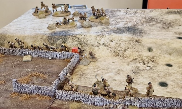 The Italians got the drop on the British taking out the boys anti-tank rifle and a light anti-tank gun during the first engagement. They also managed to range in with their mortars reducing the effectiveness of the British 25 pdr. With the early success the hot blooded Italians and their local troops advanced toward the village while the British command had a brew delaying over half the infantry from entering the fray.